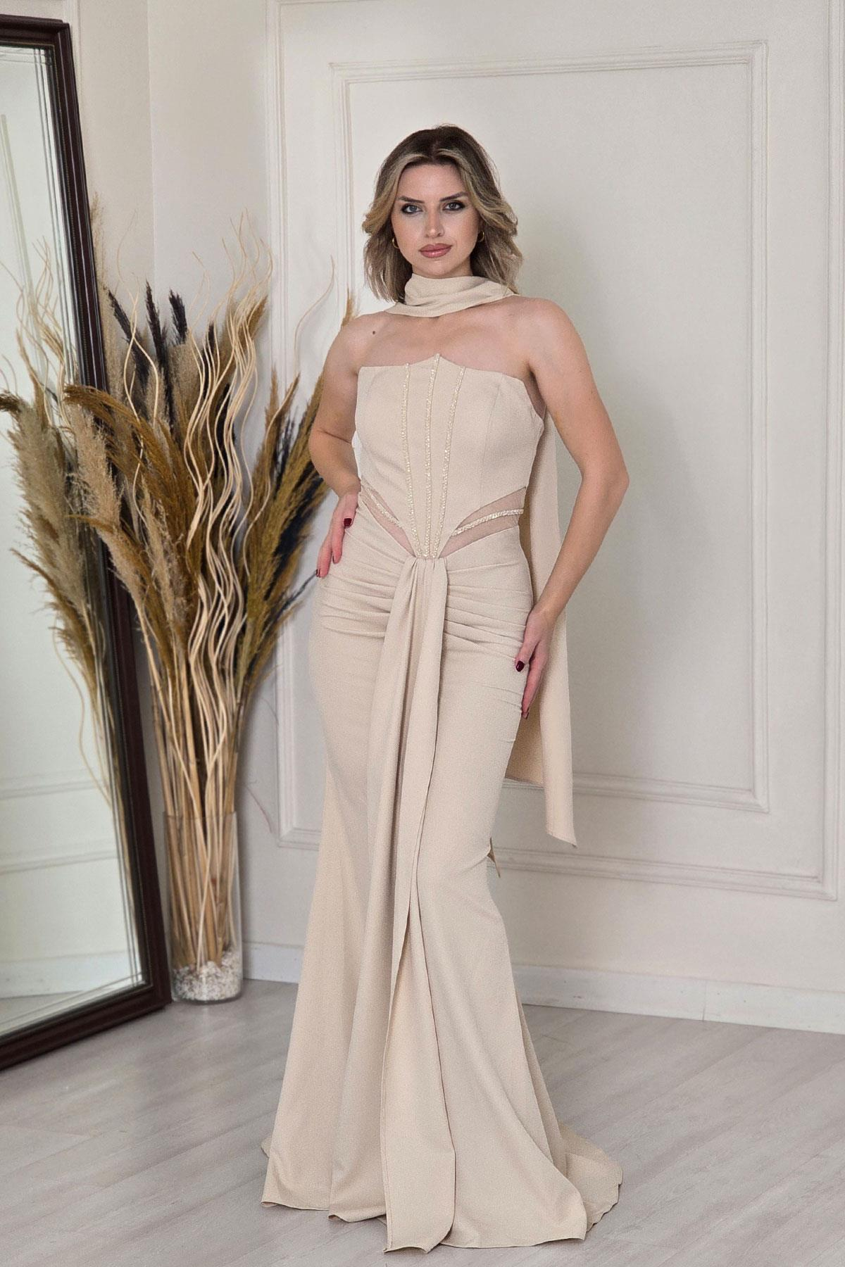 Bej Drapeli Taşlı Straplez Abiye 9001-1