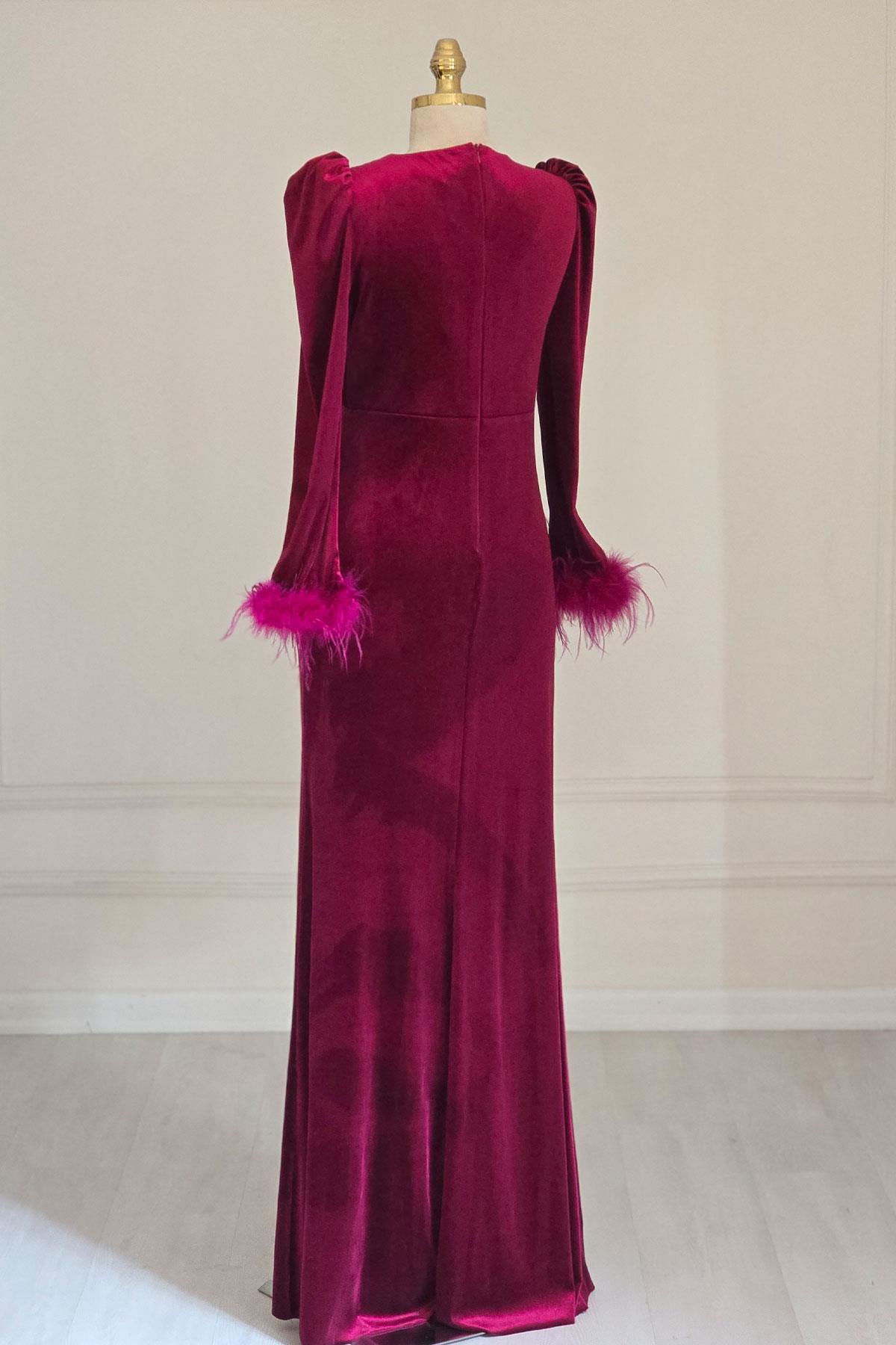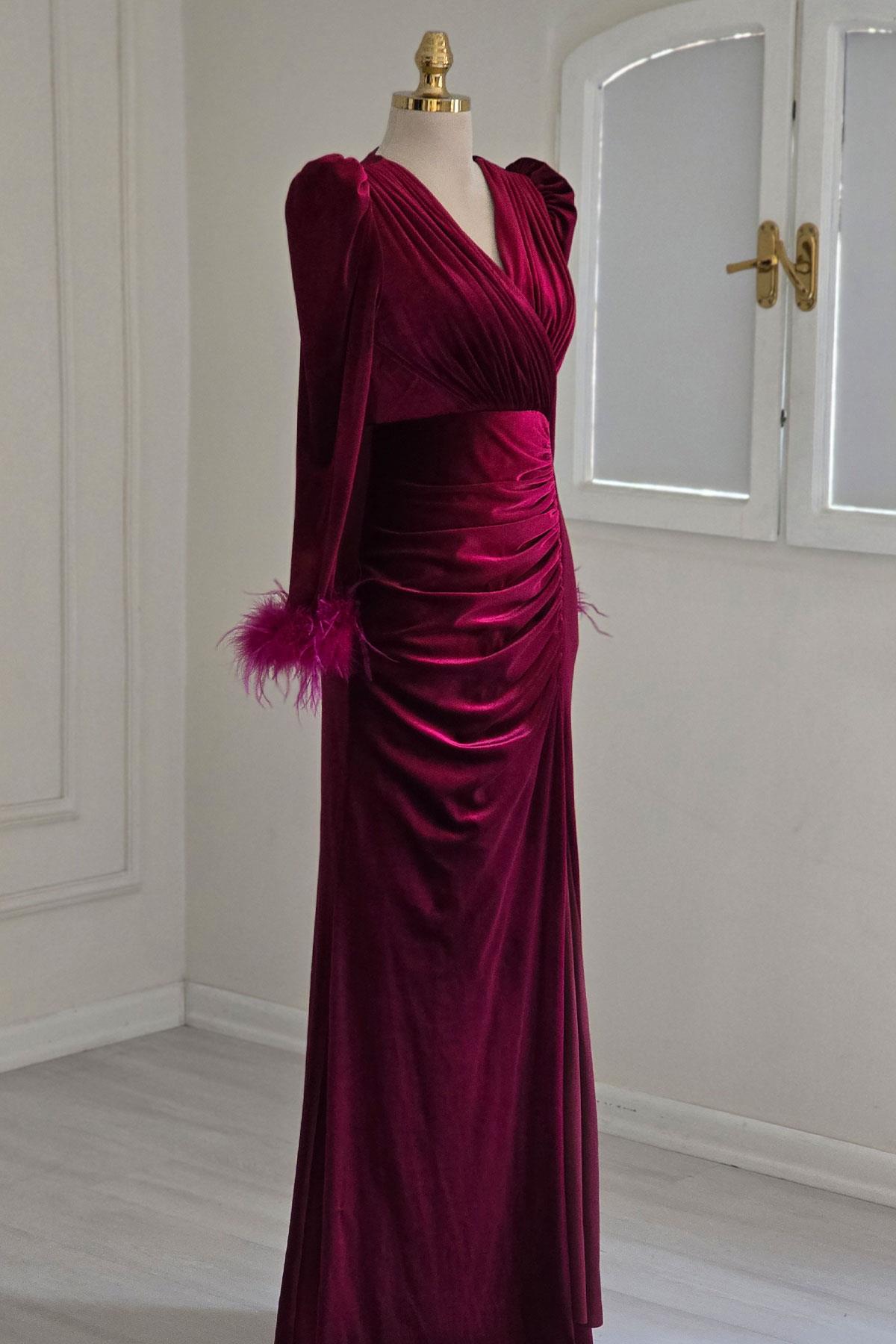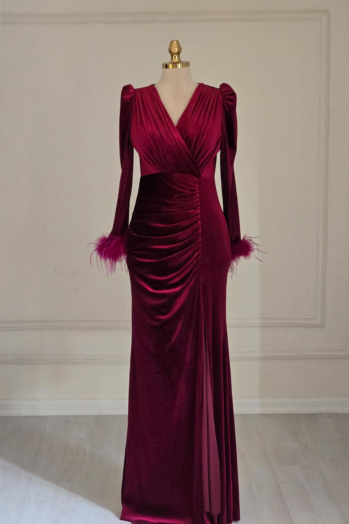 Bordo Kadife Otrişli Yırtmaçlı Abiye 8209