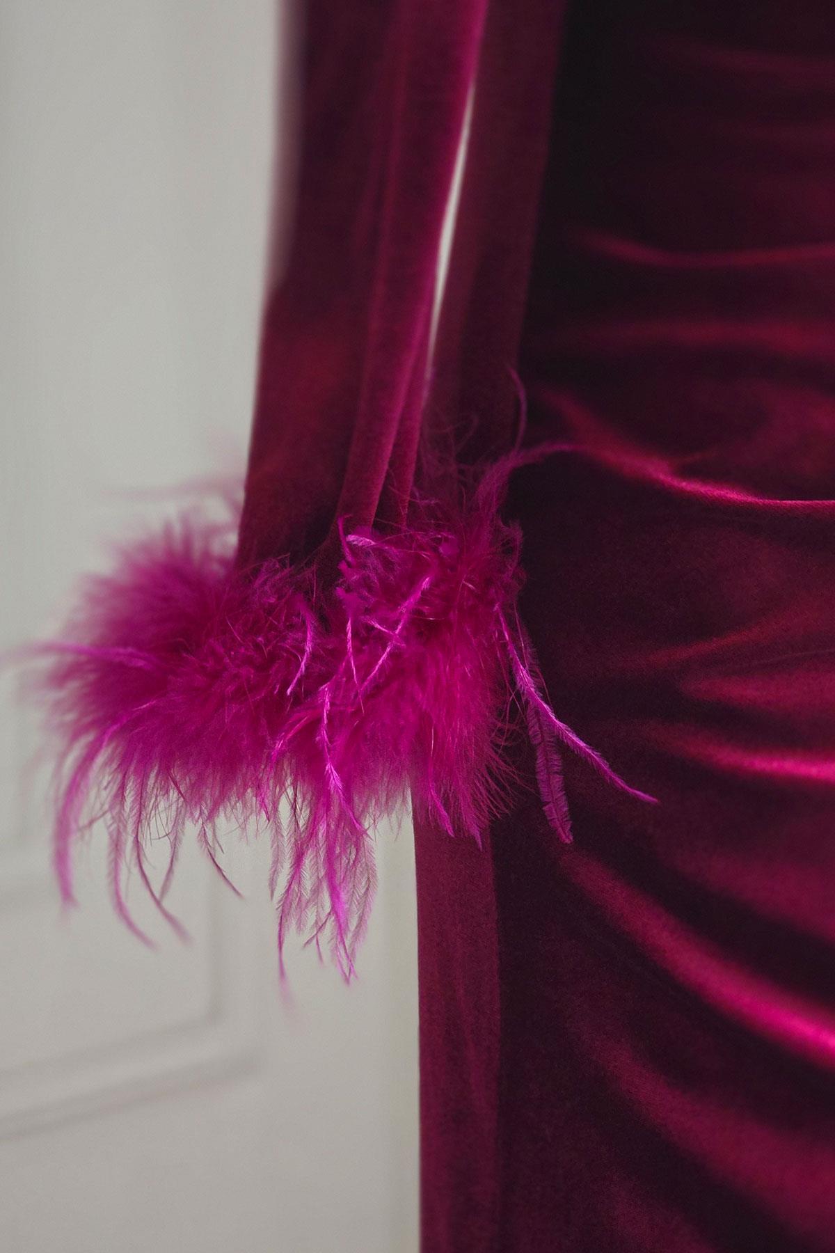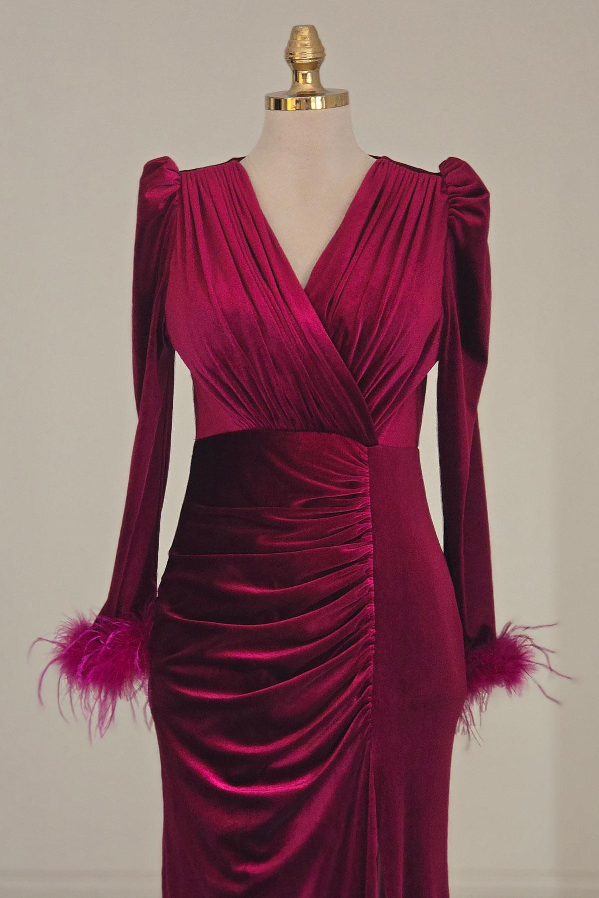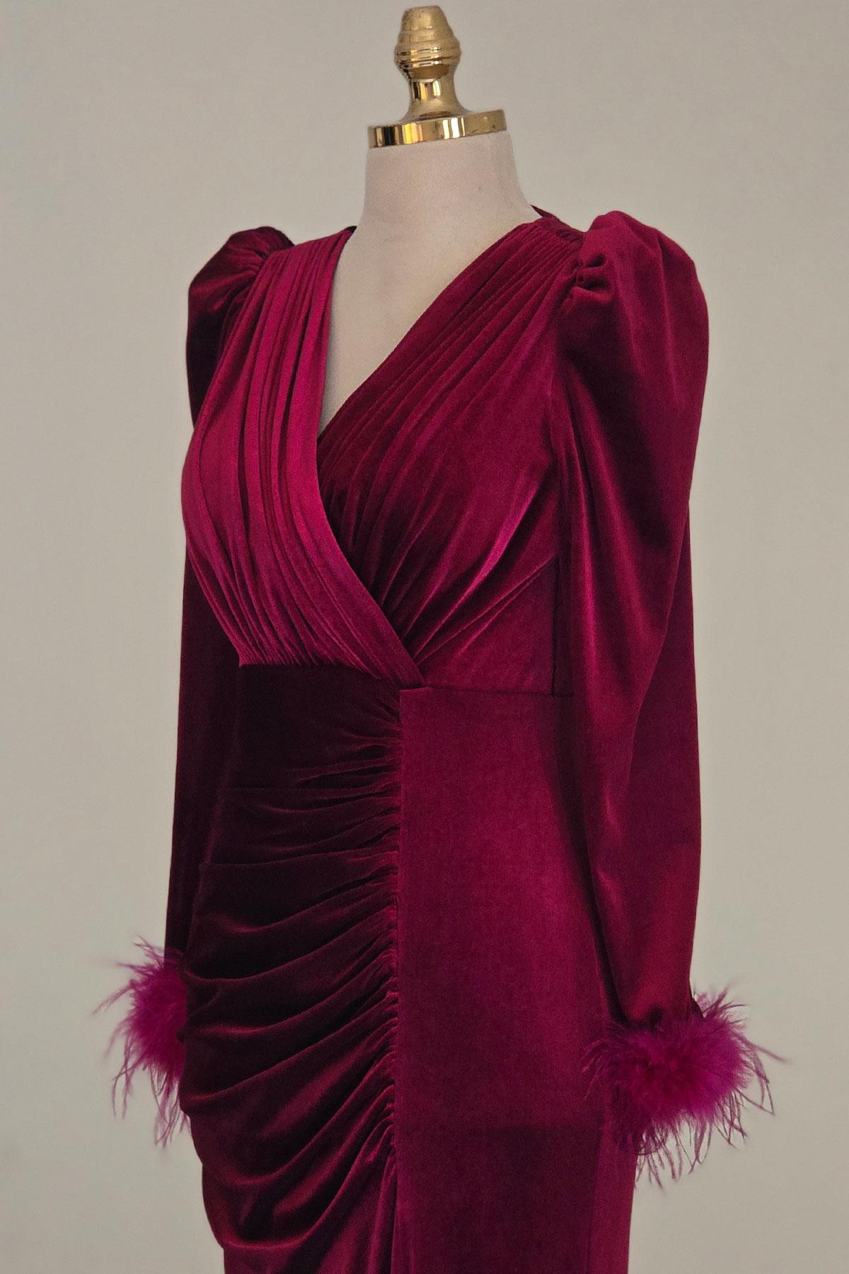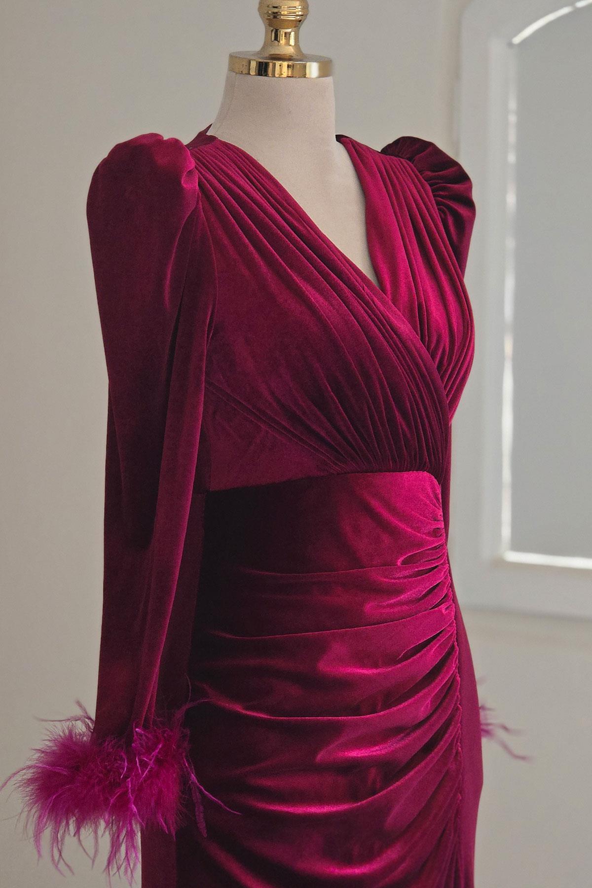 Bordo Kadife Otrişli Yırtmaçlı Abiye 8209
