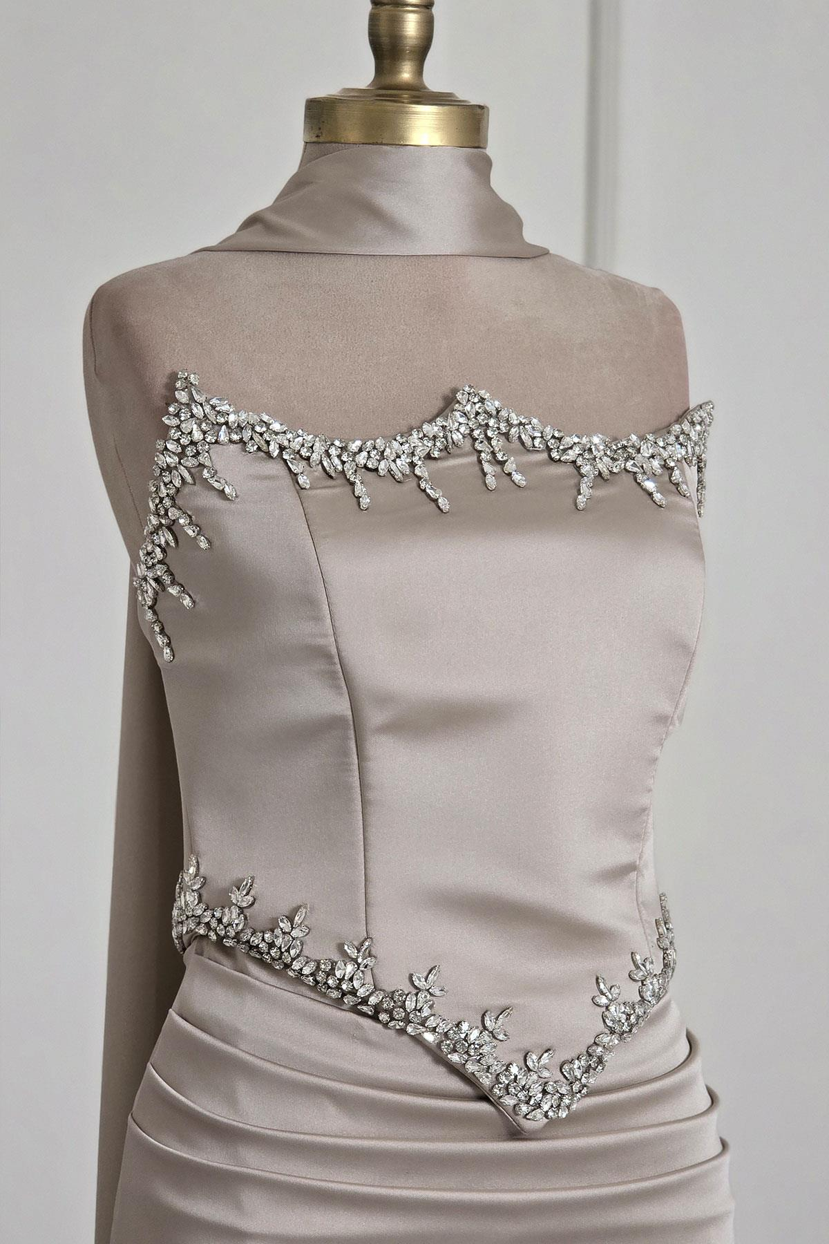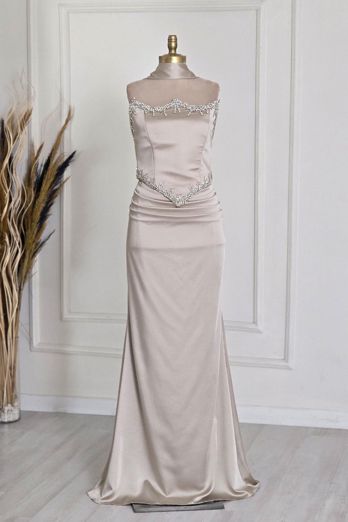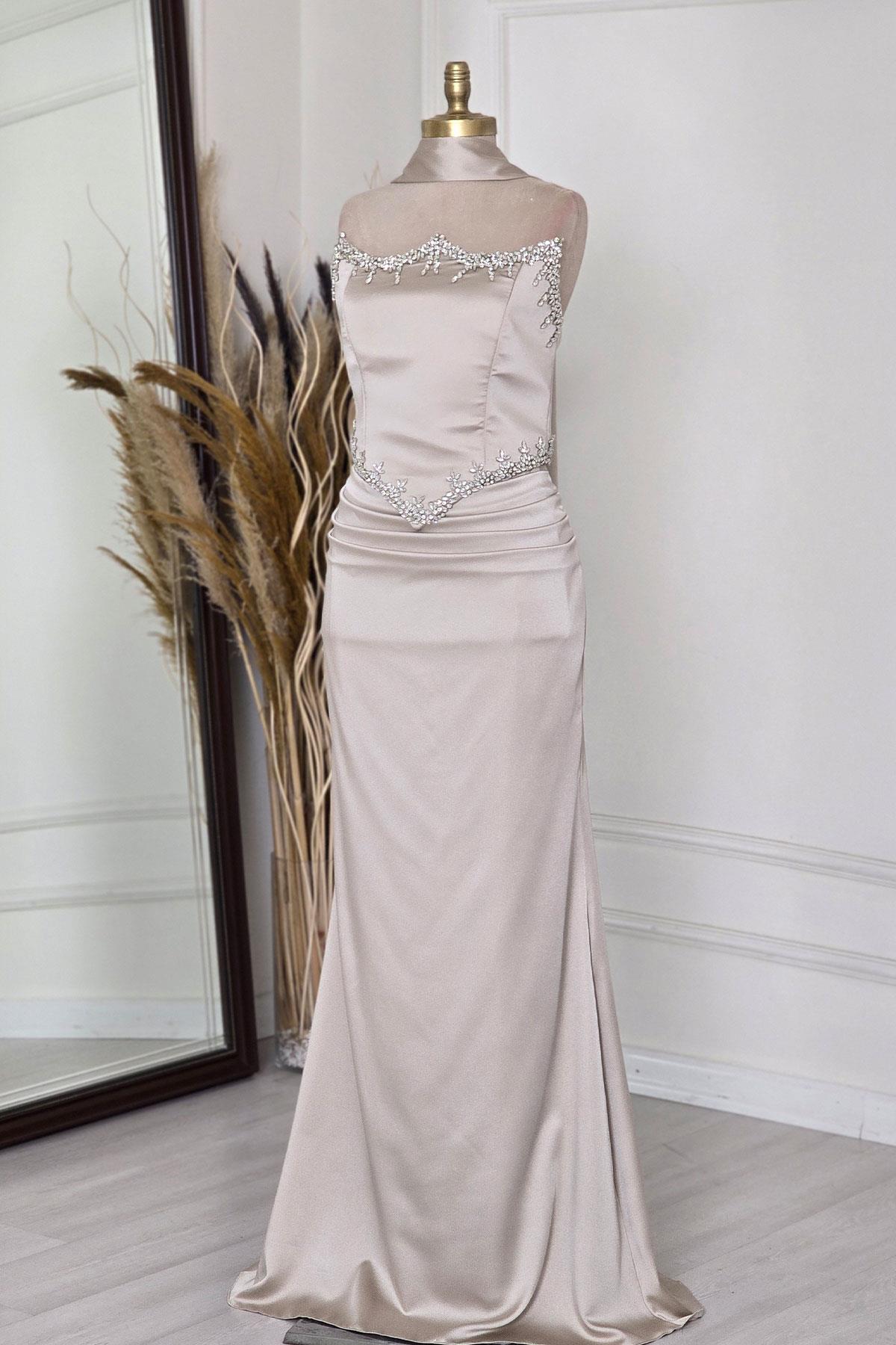 Ekru Taşlı Korseli Abiye 6135