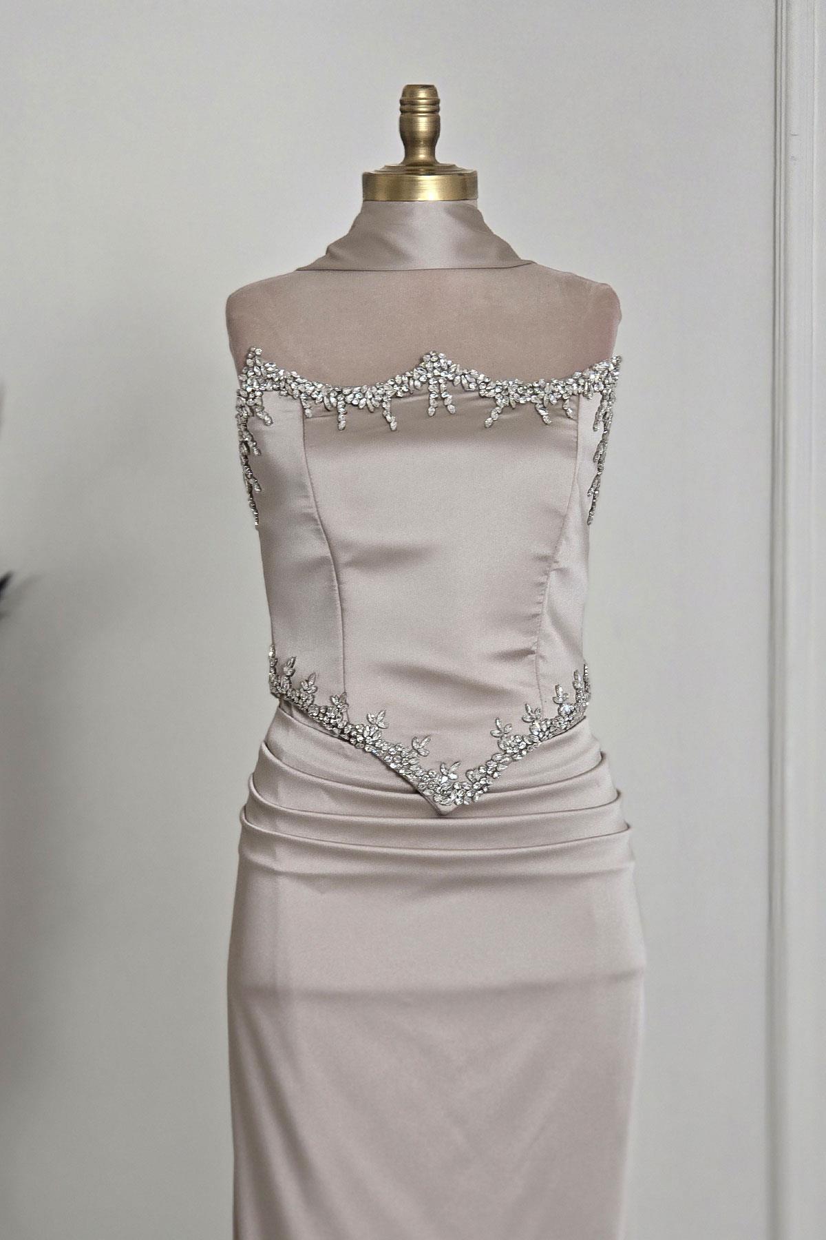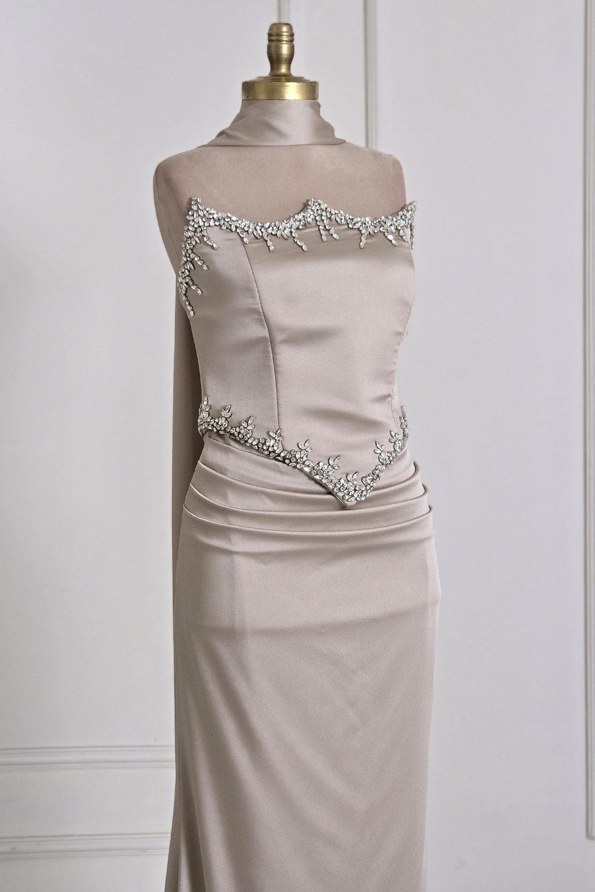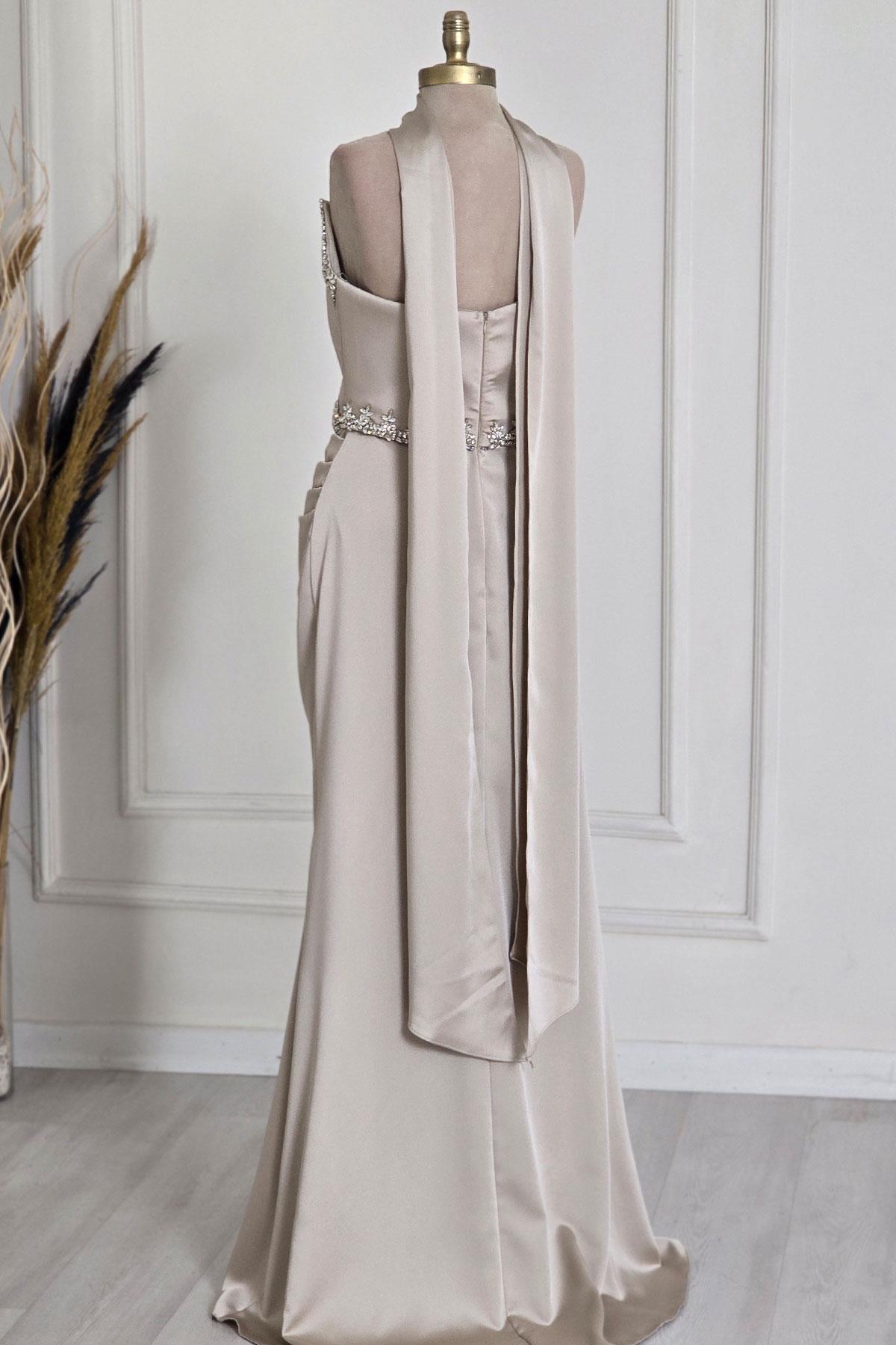 Ekru Taşlı Korseli Abiye 6135
