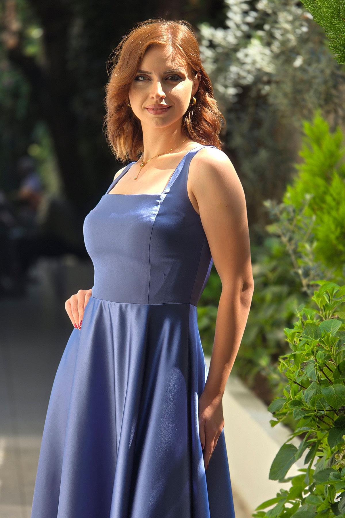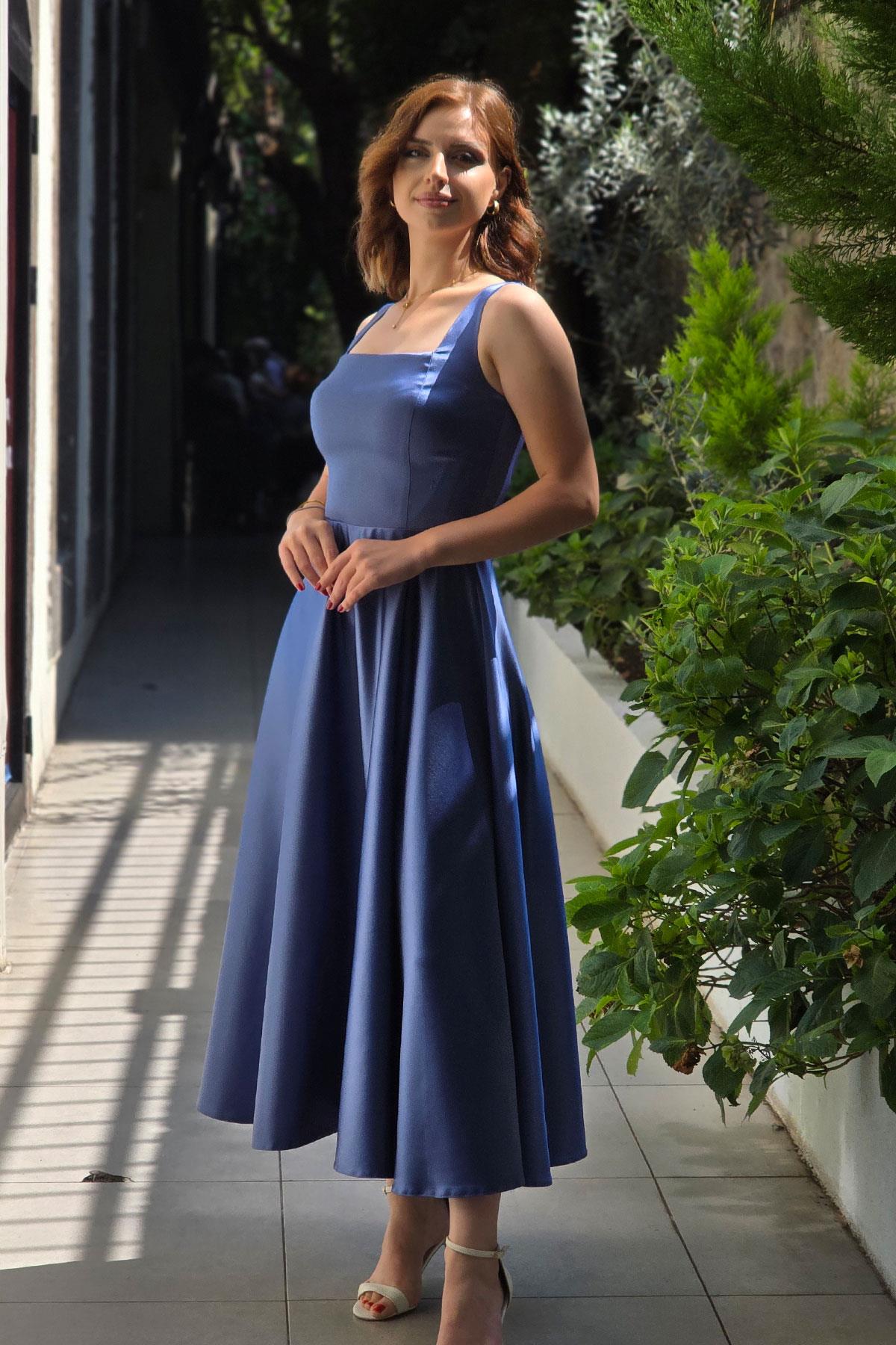 İndigo Kare Yaka Askılı Midi Boy Abiye 7000