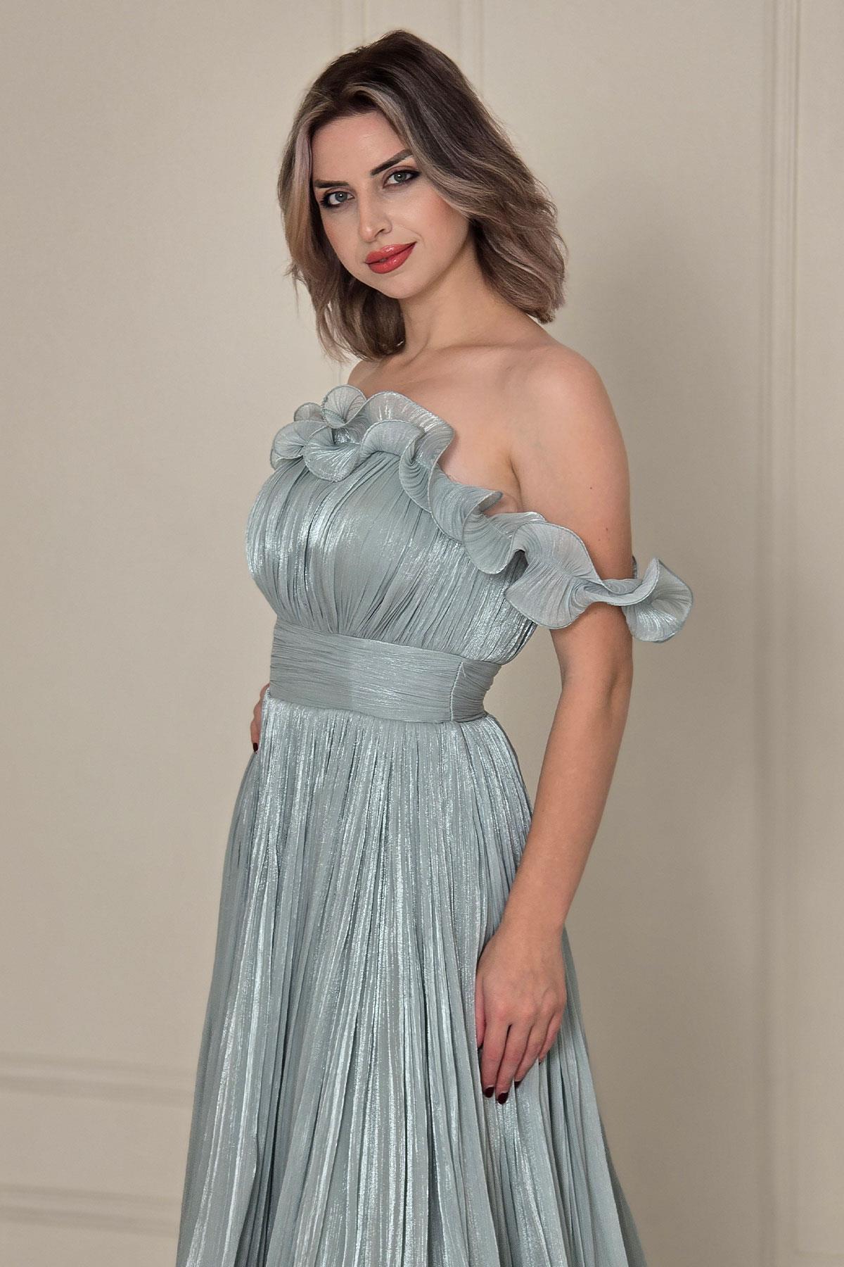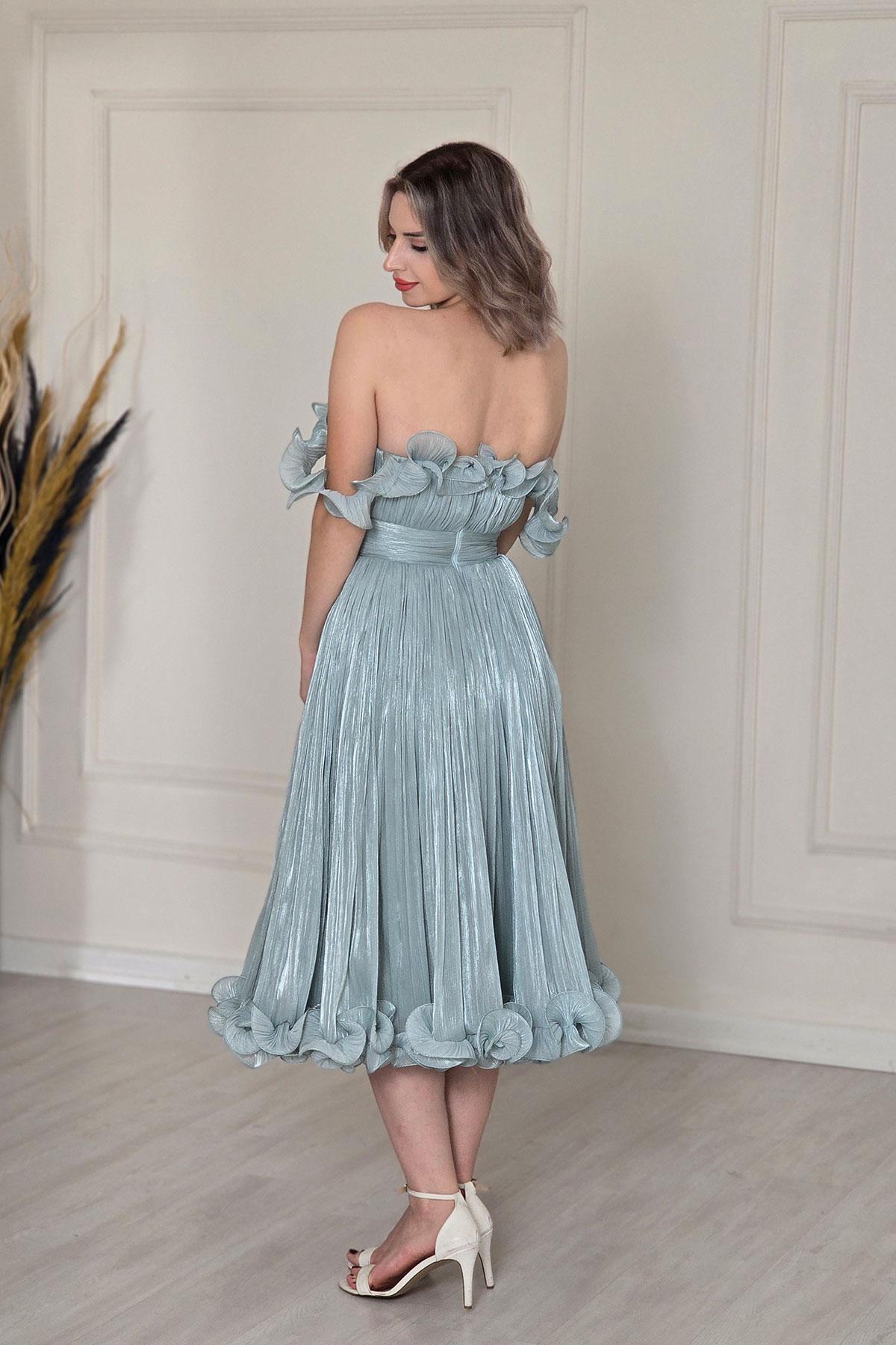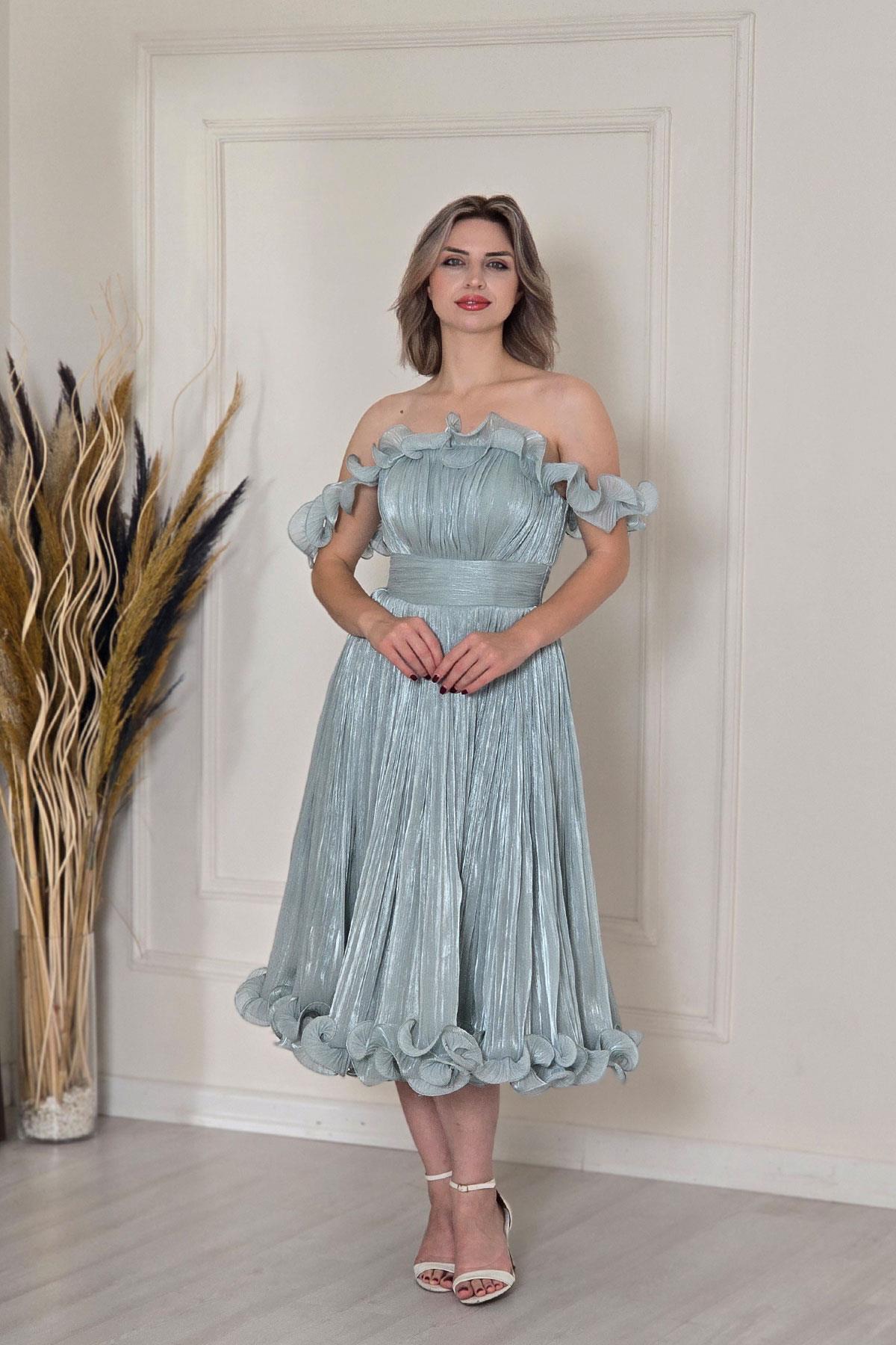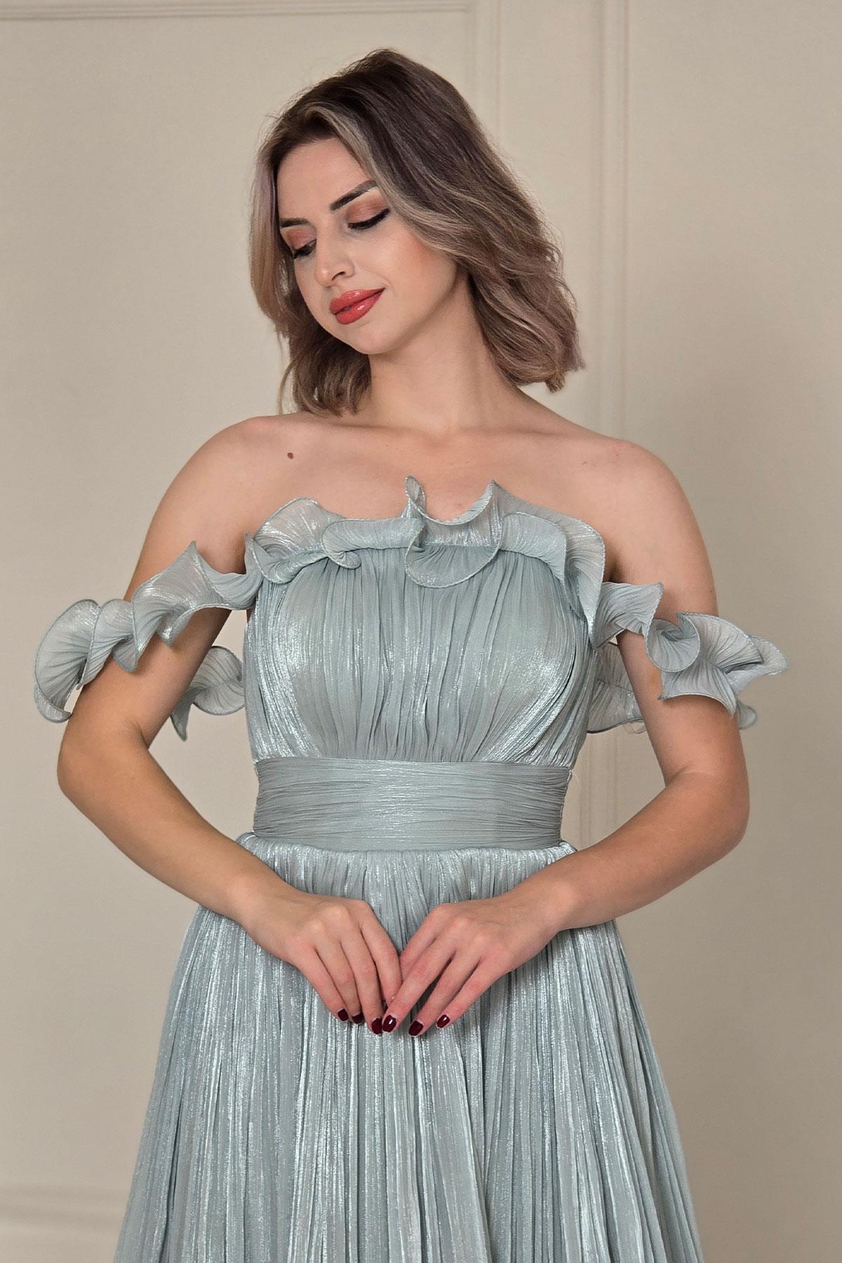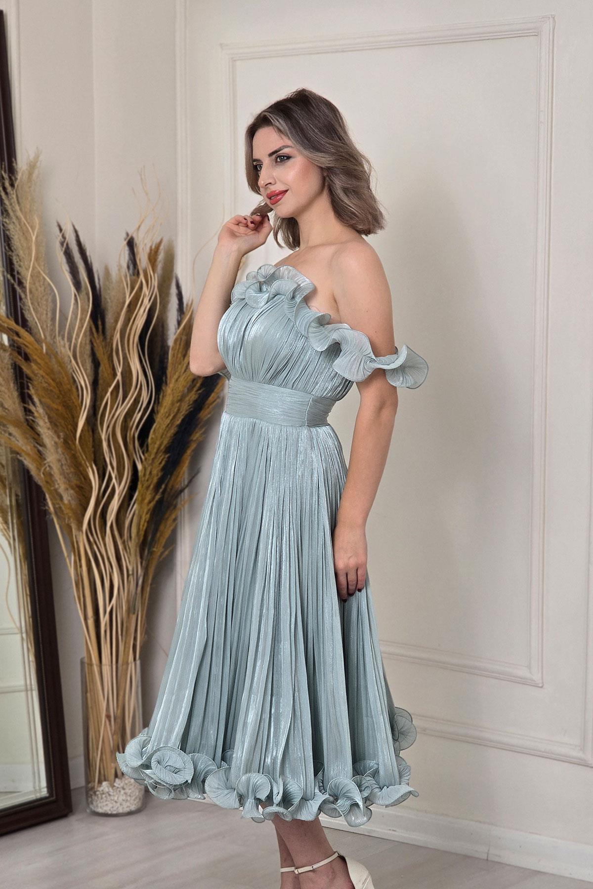 Mint Büzgülü Kemerli Midi Boy Abiye 6062