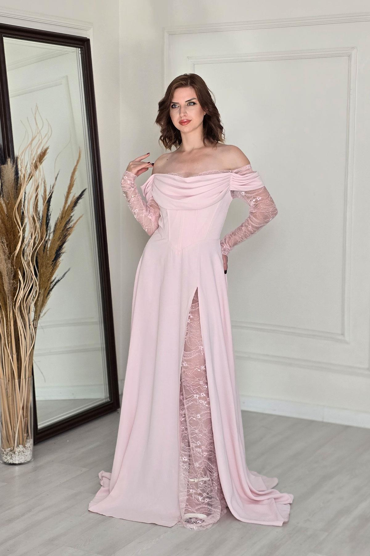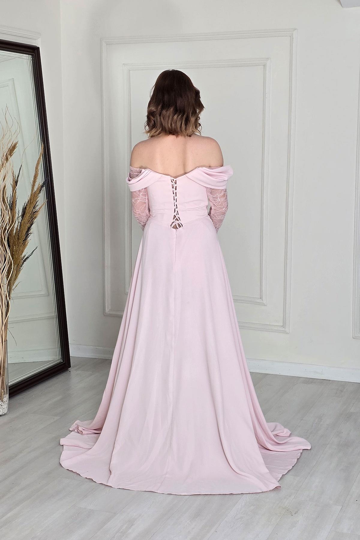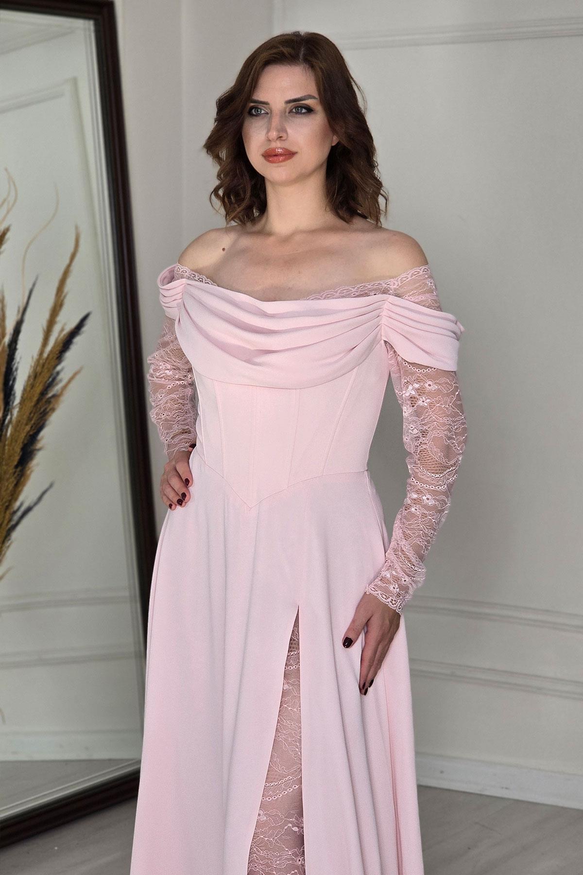 Pembe Dantel Kollu Tasarım Elbise 2718