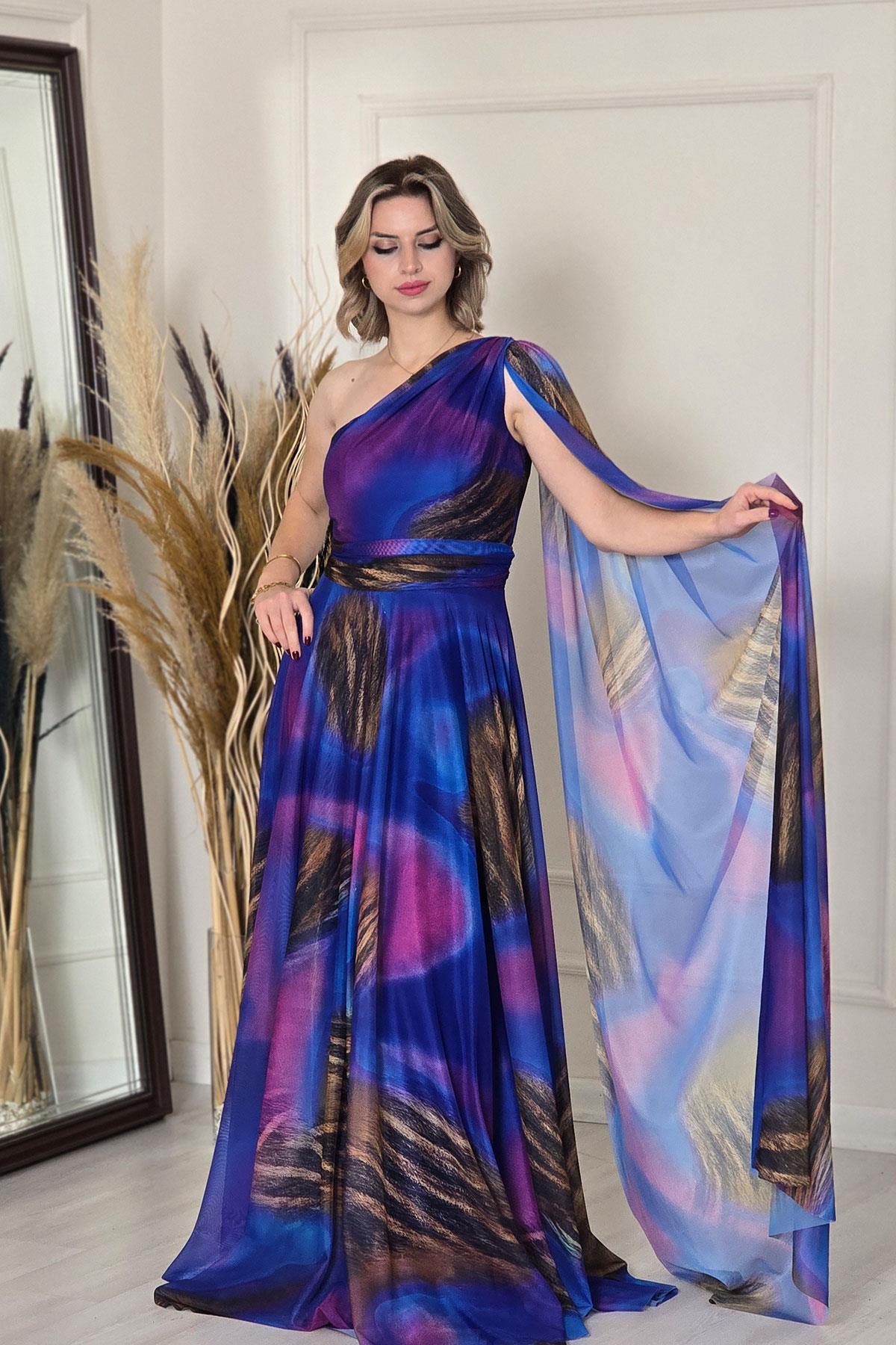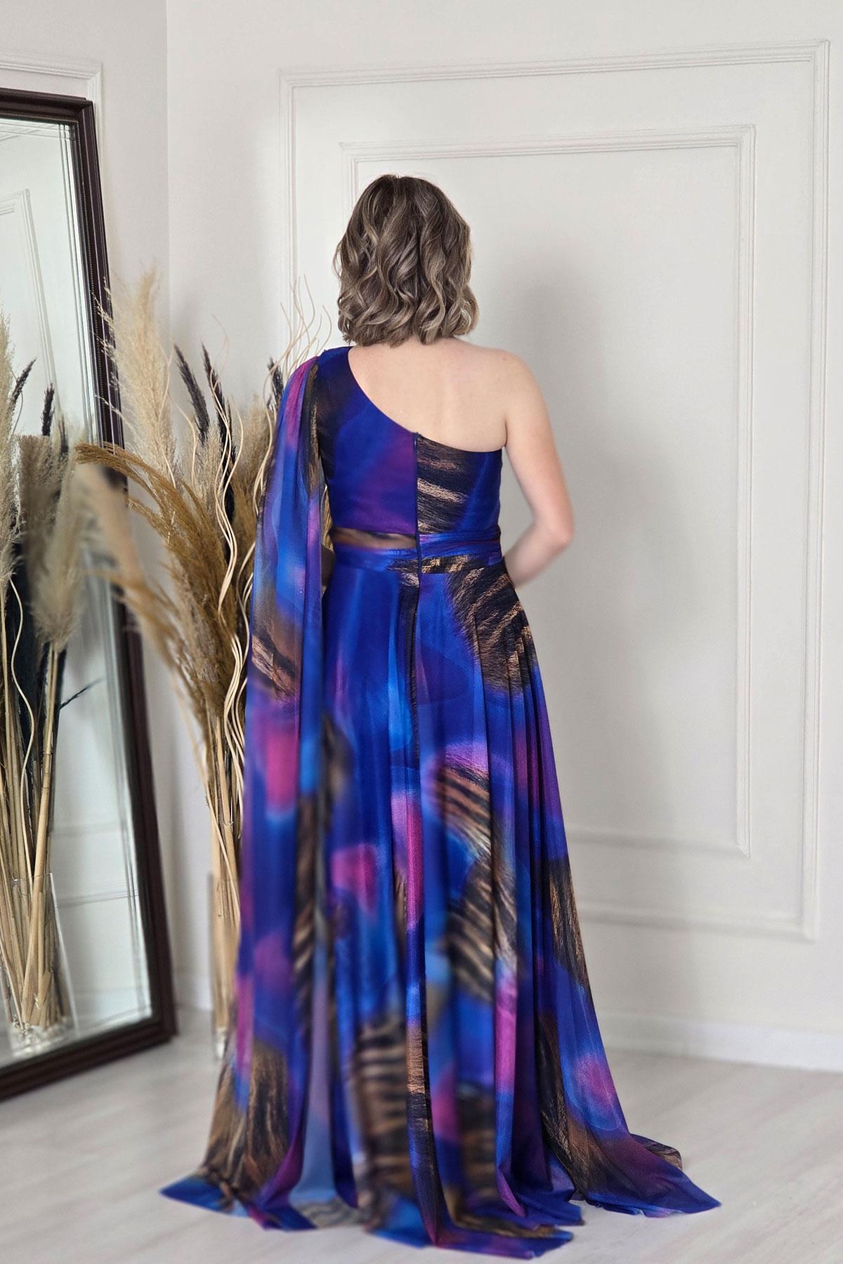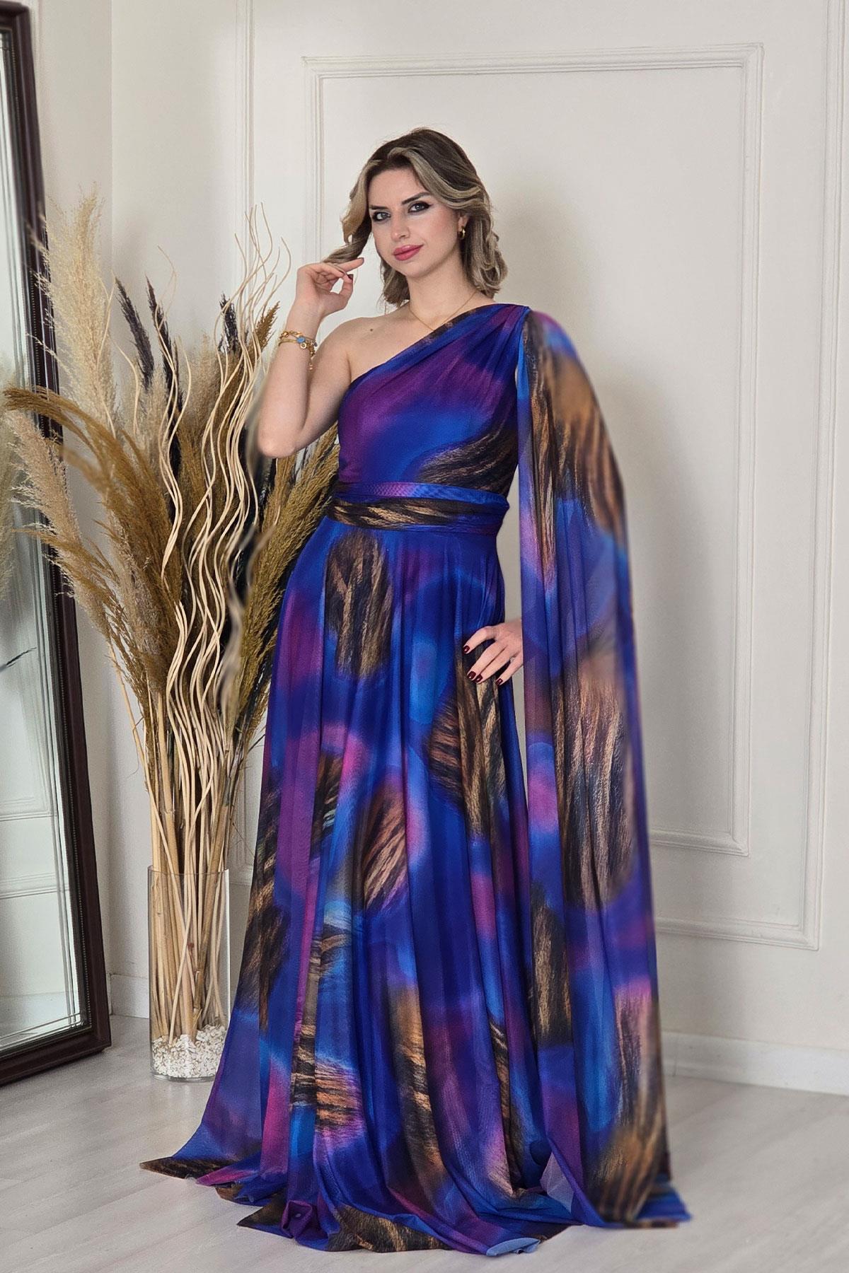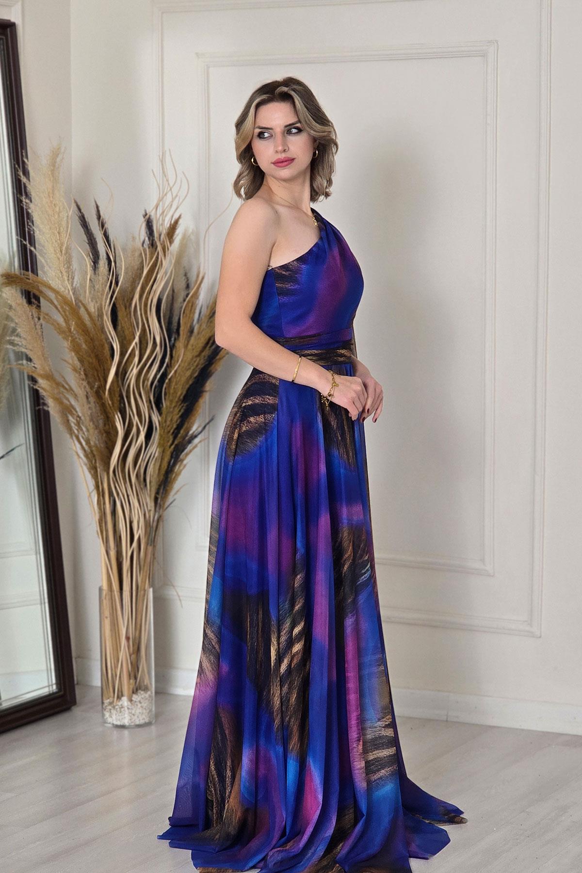 Saks Mavi Tek Omuz Desenli Abiye 7280