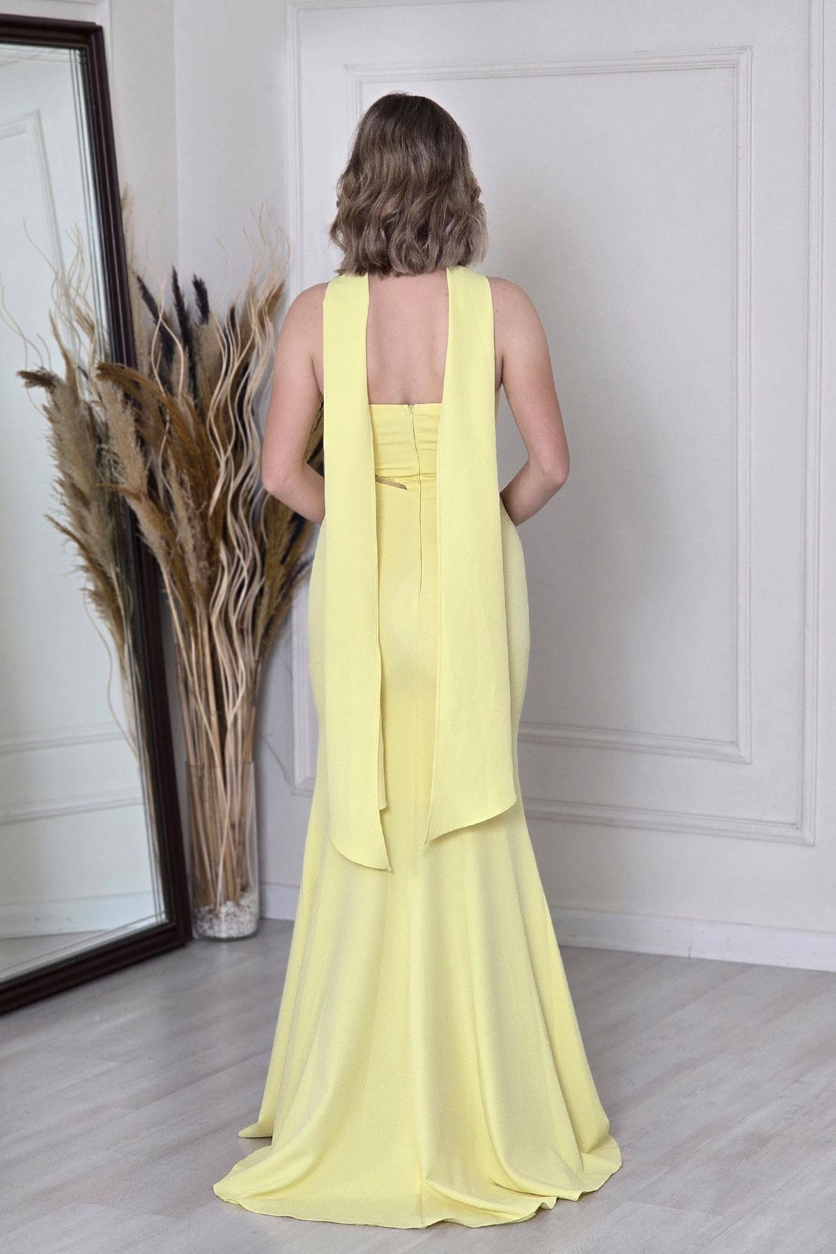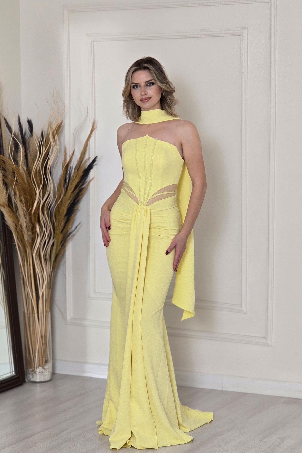 Sarı Drapeli Taşlı Straplez Abiye 9001-1