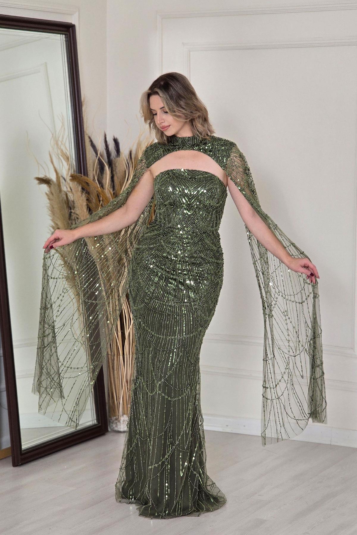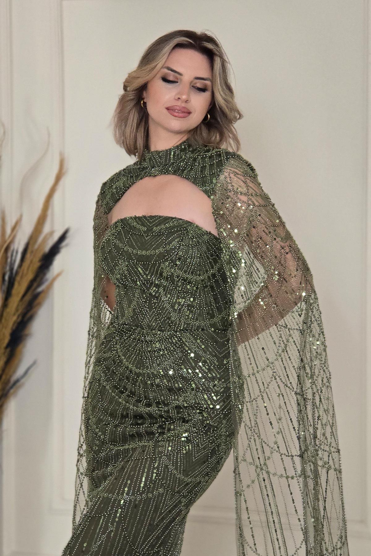 Yeşil Pelerinli Midi Boy Elbise 9011