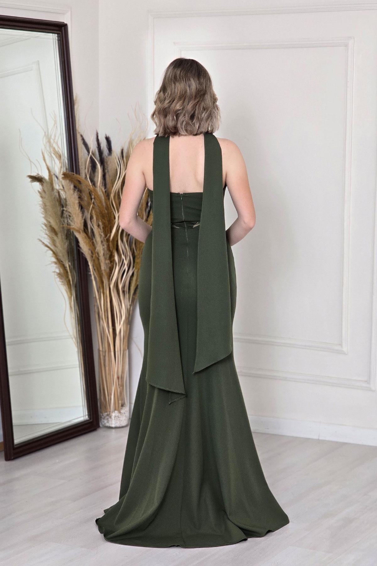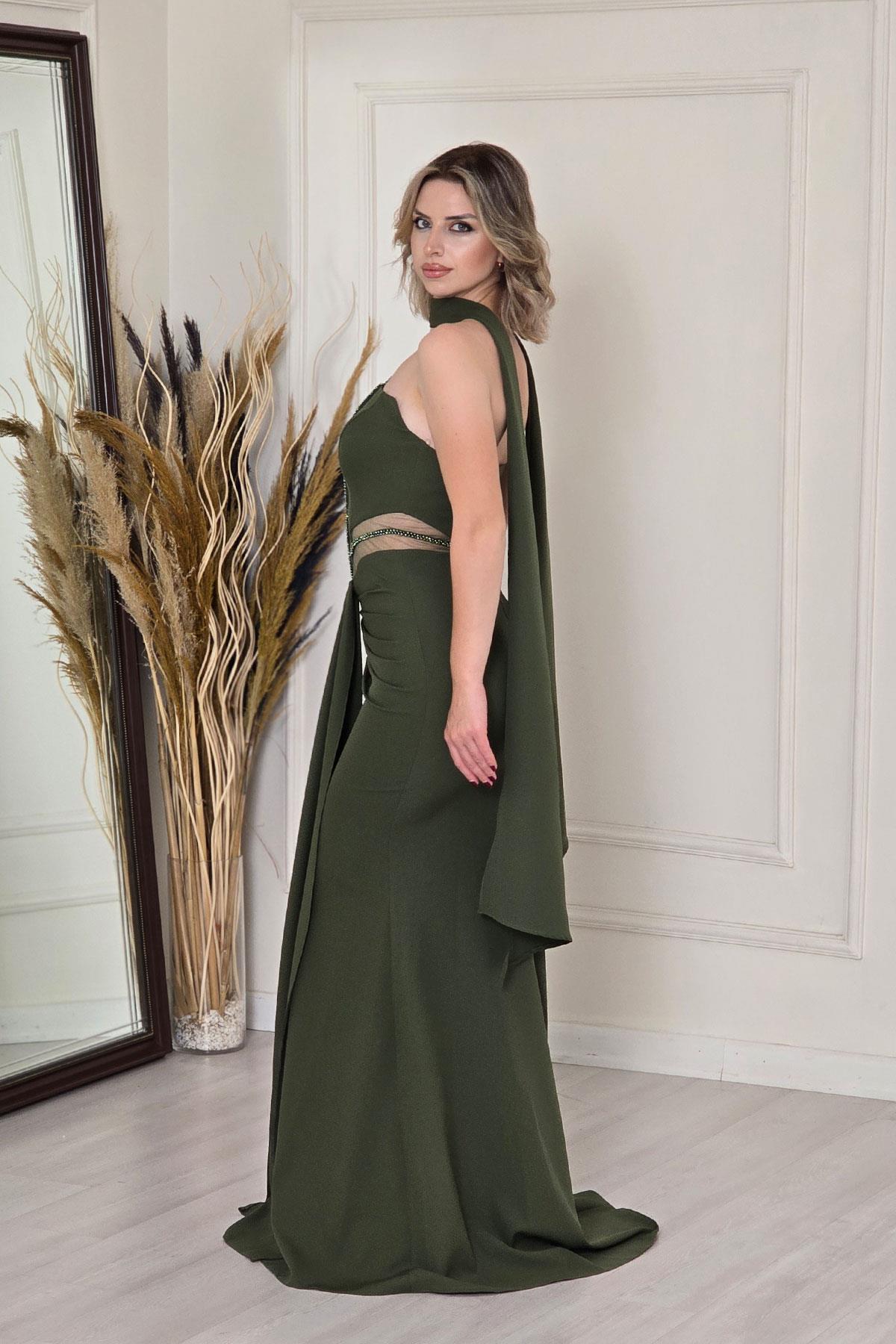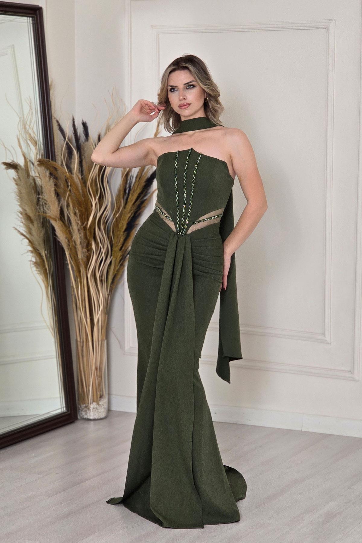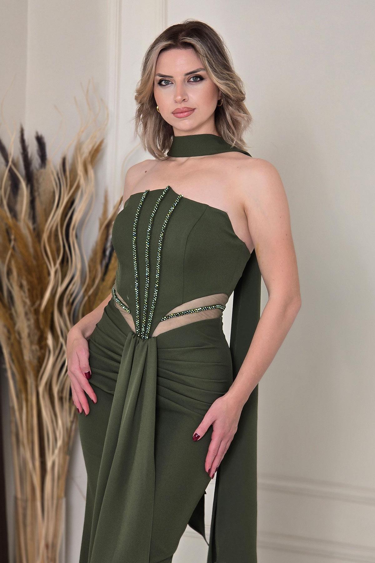 Zümrüt Drapeli Taşlı Straplez Abiye 9001-1